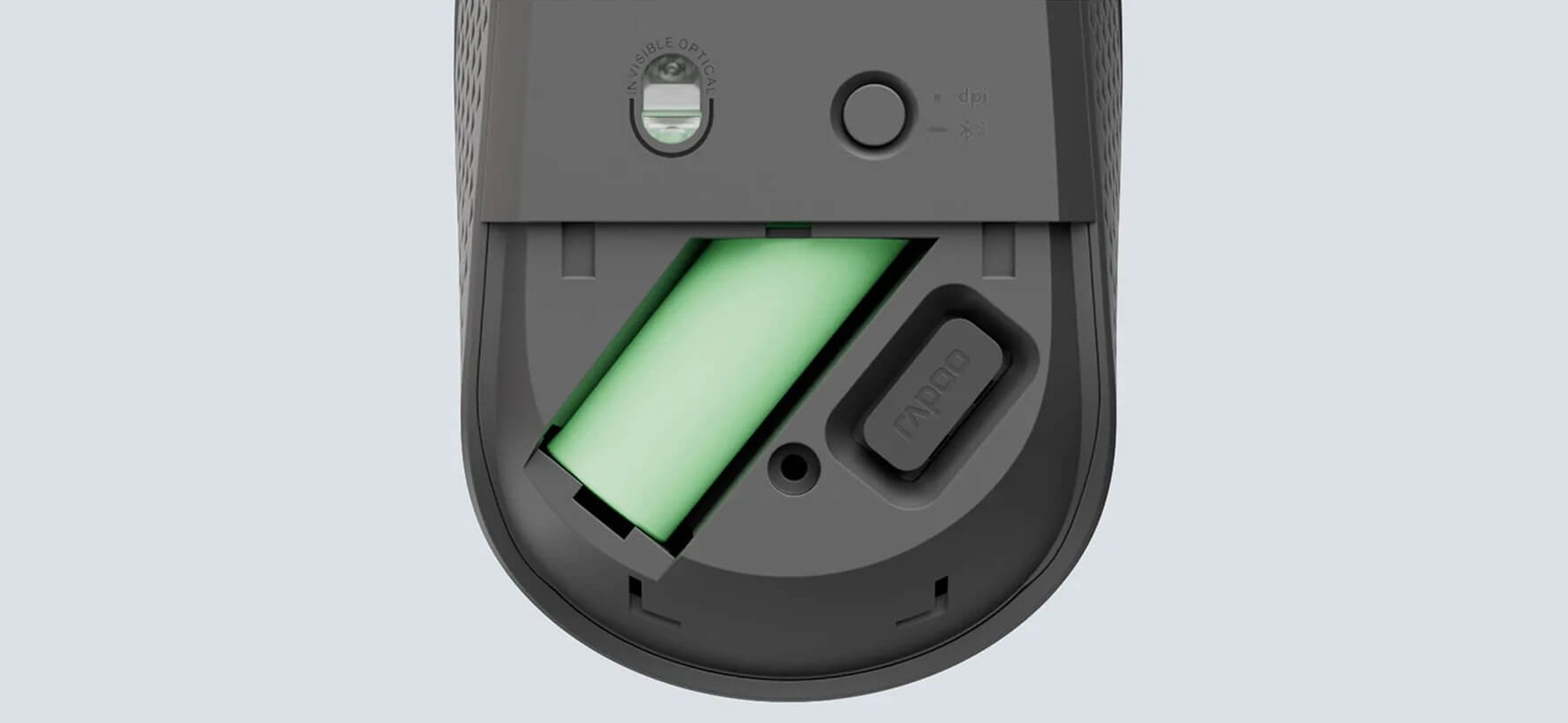 RAPOO M100 Silent подключается по беспроводному радиоканалу через USB-ресивер с интерфейсом USB Type-A. Радиус действия до 10 метров позволяет свободно использовать мышь без проводов и ограничений по расположению рабочего места. Питание осуществляется от одной батарейки формата AA, что упрощает замену источника энергии без подзарядки. Такой вариант удобен для длительного использования и поездок, когда нет доступа к розетке.