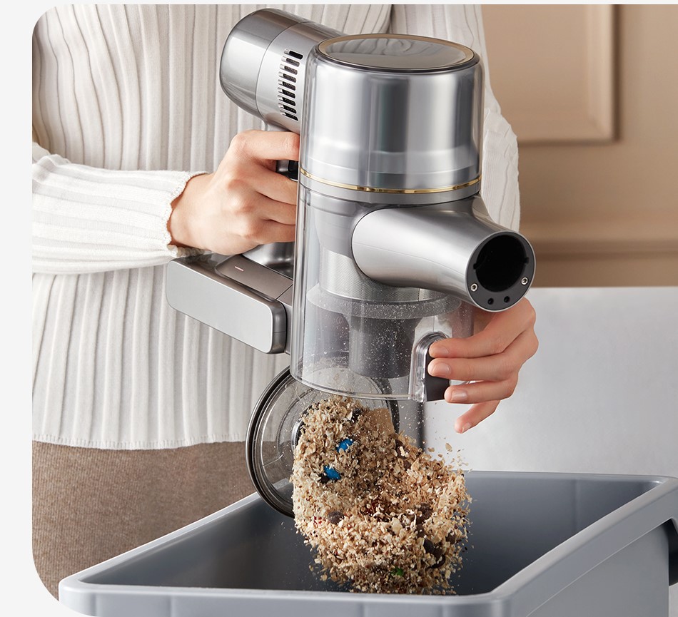 Усовершенствованная многоуровневая система фильтрации Dreame R20 улавливает пыль и частицы с эффективностью 99,9%. Пыль надежно запирается внутри контейнера.