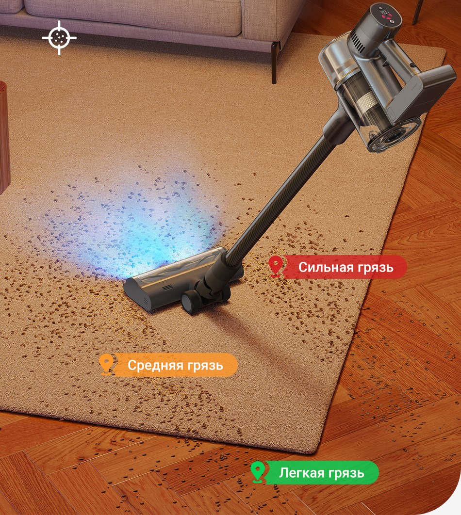 Пылесос Dreame R20 опледеляет уровень запыленности и автоматически регулирует мощность всасывания, чтобы выполнить уборку эффективнее.