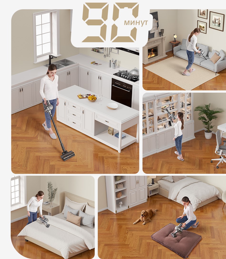 Dreame R20 стабильно работает до 90 минут, благодаря аккумулятору 8*2900 мАч.