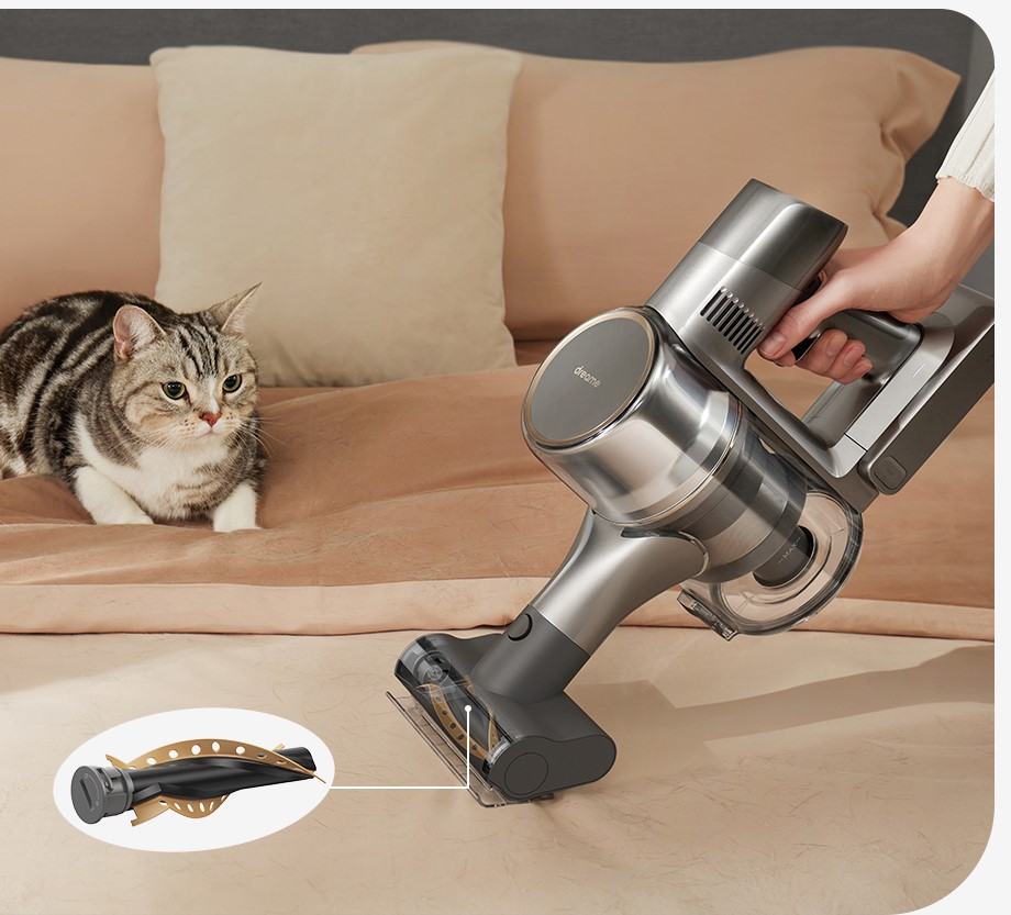 Dreame R20 удалит шерсть, пух, перхоть домашних животных с ткани и мягкой мебели с помощью специально разработанной мини-электрощетке.