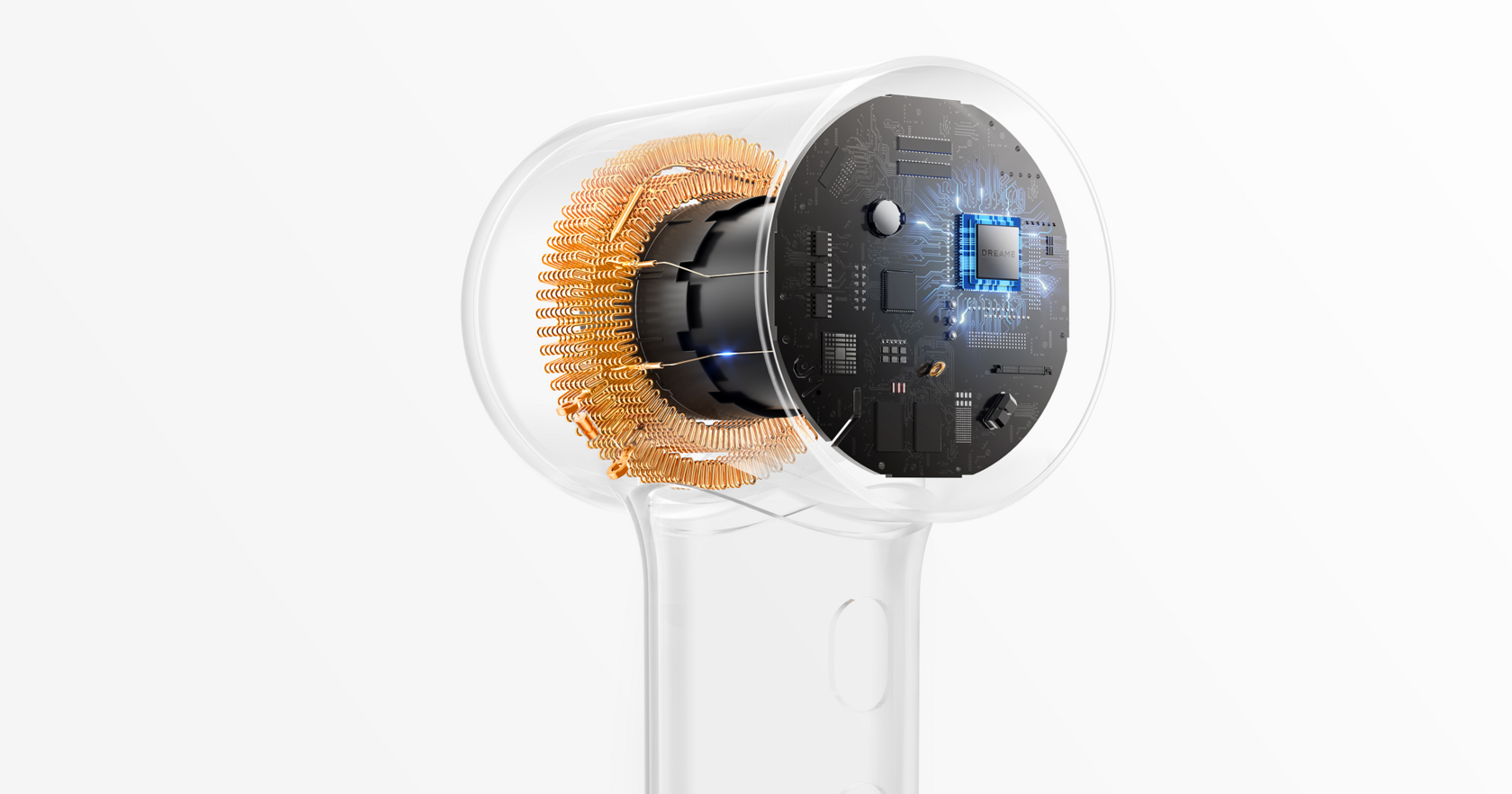 Несмотря на компактность, фен оснащён мотором с частотой вращения до 100 000 об/мин и мощностью 1200 Вт. Он создаёт стабильный поток воздуха, обеспечивая быструю сушку без перегрева. Такой показатель сравним с крупными моделями, но при этом устройство остаётся лёгким и удобным.