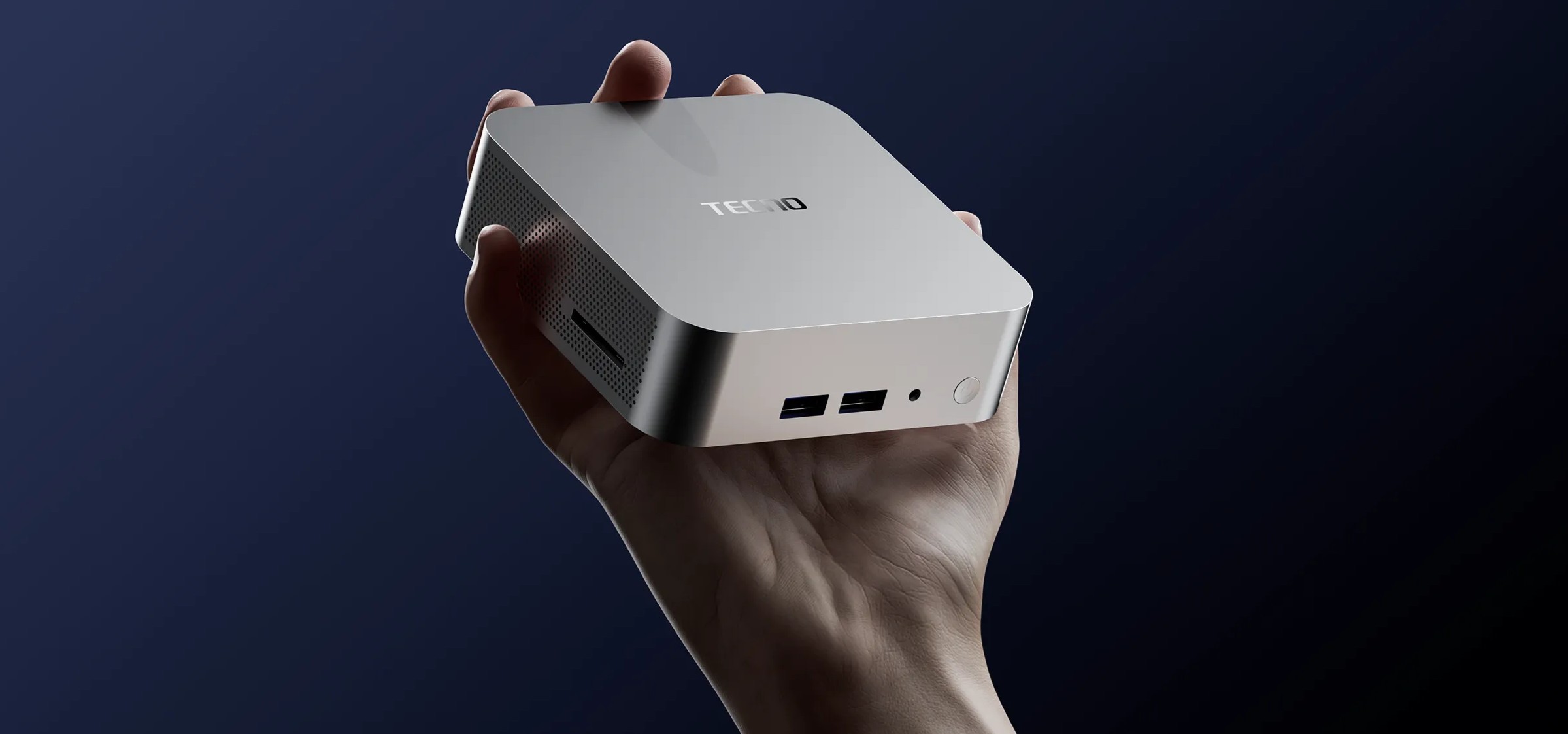 Tecno Mega Mini M1 в версии с Core i9 выполнен в ультракомпактном алюминиевом корпусе с минималистичным дизайном. Форм-фактор рассчитан на стационарное использование при минимуме занимаемого пространства. Корпус размером около 112 × 112 × 37 мм легко размещается на столе, полке или за монитором, а вес около 410 г делает устройство удобным для гибких рабочих сценариев.