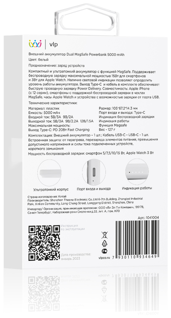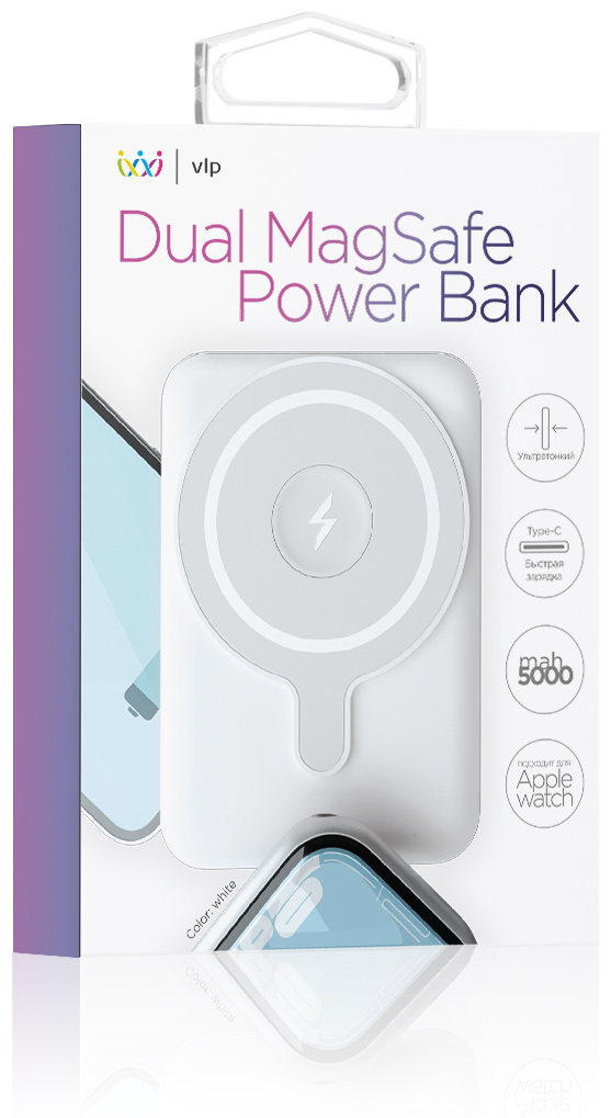 Внешний аккумулятор VLP Dual MagSafe с поддержкой беспроводной зарядки — незаменимый помощник, который позволит одновременно зарядить смартфон и смарт-часы. Устройство поддерживает протоколы быстрой зарядки. Емкость аккумулятора составляет 5 000 мАч, этого достаточно, чтобы полностью зарядить смартфон.