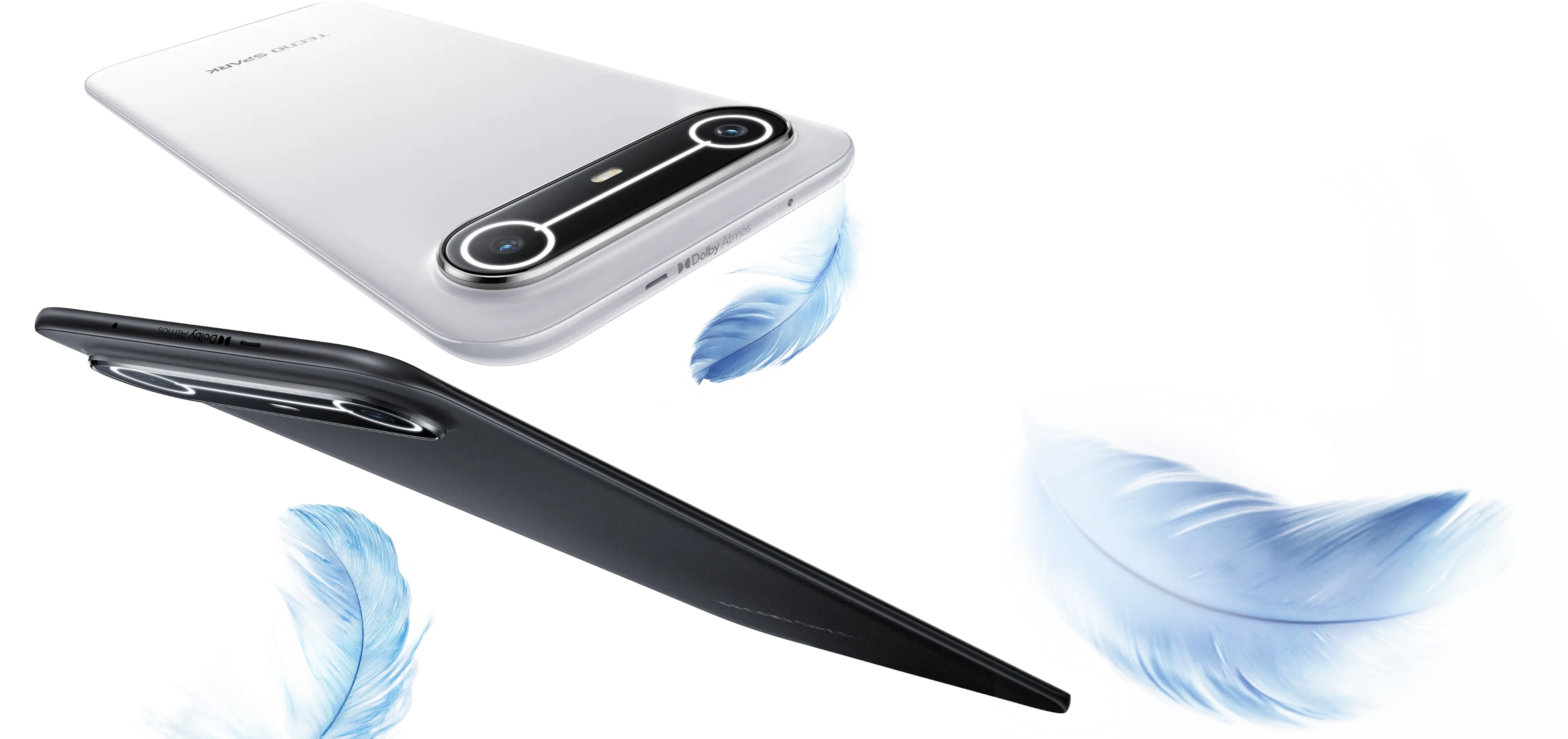 Tecno Spark Slim оправдывает своё название — это один из самых тонких смартфонов бренда. Его толщина составляет всего 5,93 мм, а вес — всего 154 грамма, что делает устройство невероятно лёгким и удобным в руке. Корпус выполнен из прочного стекловолокна, устойчивого к царапинам и отпечаткам, а защита IP64 оберегает смартфон от пыли и брызг. Элегантные линии корпуса и матовая текстура придают модели современный премиальный вид.