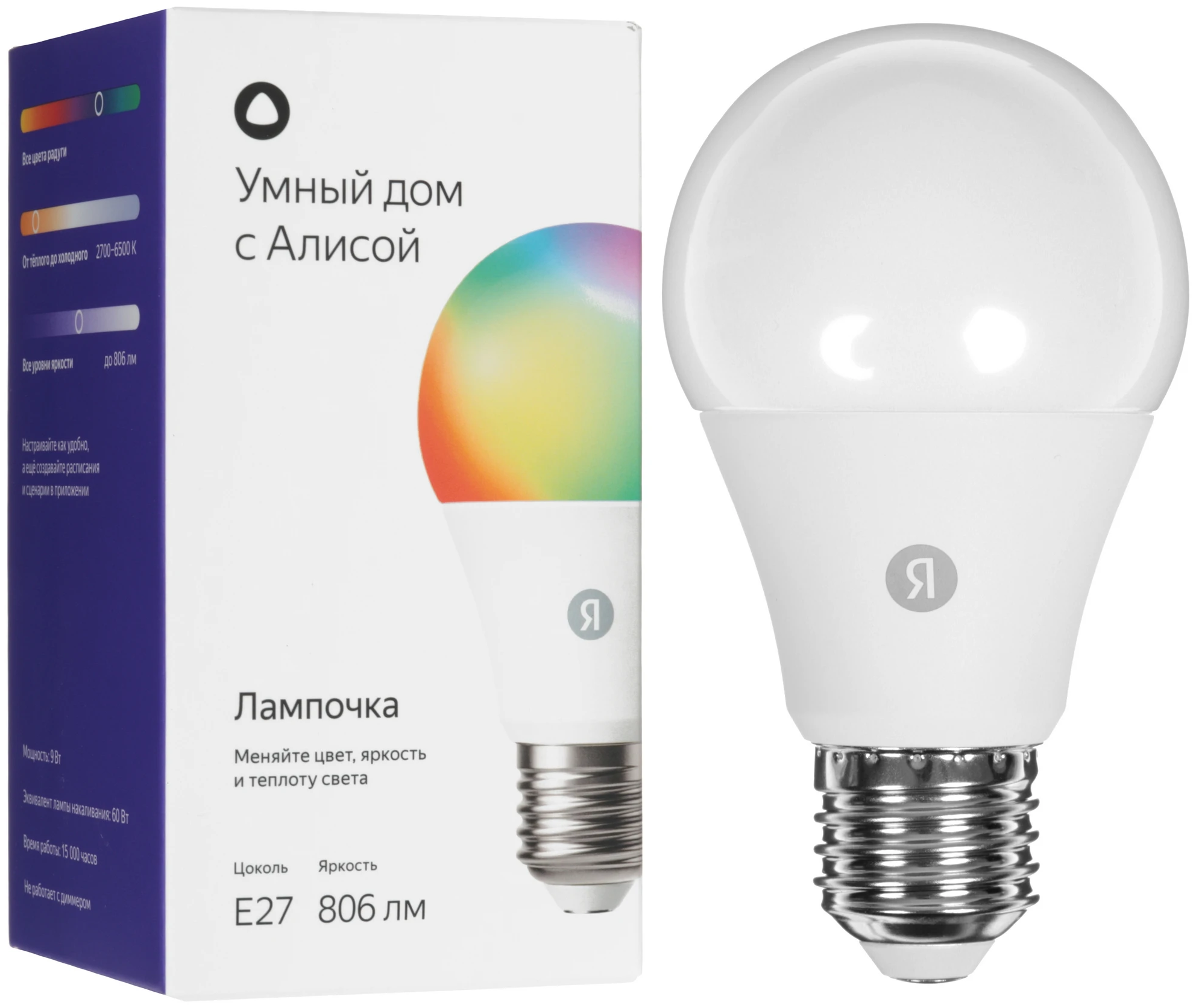 | Дополнительно | мощность 9 Вт, цветовая температура 2700-6500 К, световой поток до 806 лм, цоколь Е27 |