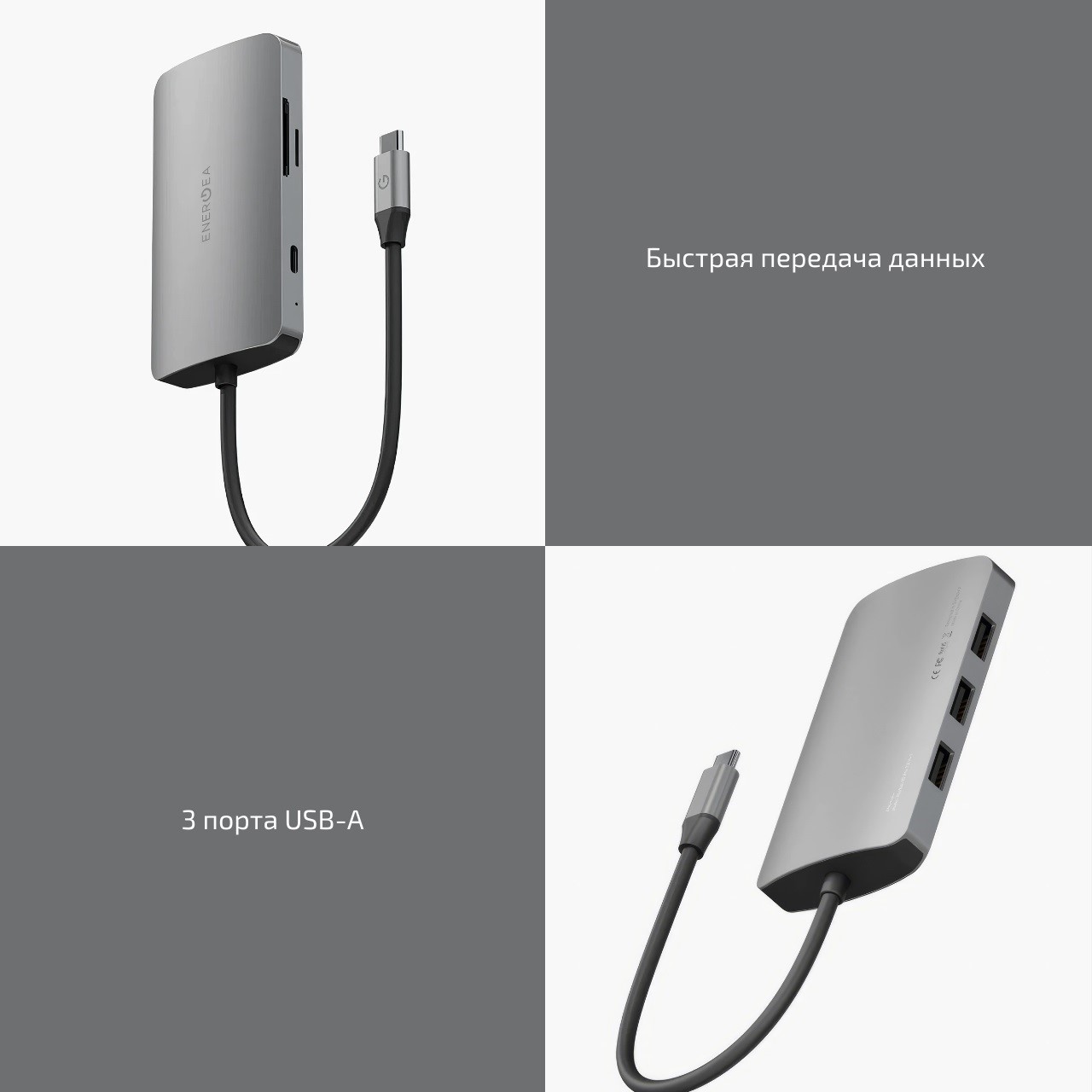 Люди снимающие на камеру знают, как больно становится от того, что используемый формат флэш-карты никуда кроме этой камеры вставить не получается. Но, Energea решают и эту проблему, ведь их хаб имеет в себе сразу оба разъёма: под SD и MicroSD карты. Отчего теперь можно быстро скинуть фотографии заказчикам, или ретушировать их прямо на месте, без танцев с бубном. И это ещё не говоря о том, что имеются три порта USB-A версии 2.0. со скоростью передачи данных в 480 Мбит/с. Благодаря чему можно подключить флешку, или мышку и работать с комфортом.